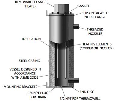 There are different types and configurations of immersion heater that can be used in petroleum refining processes; however they all possess a common important part: the heater elements. A heater (or heating) element is a metallic tube that is used to heat the liquid or gas via direct contact heating.