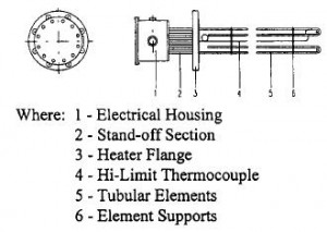 These tubular elements are welded into a flange making an immersion heater assembly. Normally an immersion heater assembly consists of heating elements, flange or tube sheet, thermocouples and its housing and bussing for element circuit (see figure below). To heat a fluid or gas directly, this heater assembly can be bolted into the tank or can be mounted into a pressure vessel.