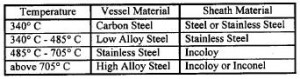 Proper sheath and vessel material selection is important. Some of the factors for material selection include, design and sheath temperature, design pressure and corrosive nature of the target medium. The follow table is a good reference6.