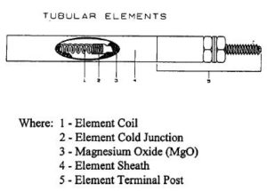 A basic tubular heating element consists of nickel-chromium (Ni-Cr) (80-20% or 70-30%) wire, which provides resistance to electricity generating heat6. Compact magnesium oxide (MgO) and a metal sheath surround the Ni-Cr wire (see figure below). Cold pins (metal conductors) make electrical connections to the resistance wire. Electric termination is available in various forms. Since MgO is very hydroscopic, so sealing is important to prevent moisture from entering.