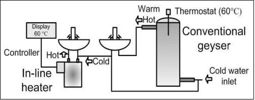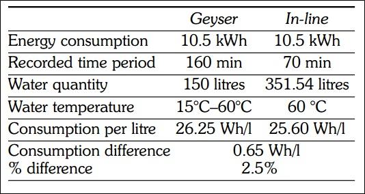 According to experimental studies the average current required by an inline heater during one cycle is 44.6 A with a flow rate of about 5l/min. A side-by-side comparison of conventional geyser and inline heaters show that inline heaters can heat more fluid consuming the same amount of power. Here is a quick look at the comparison table:
