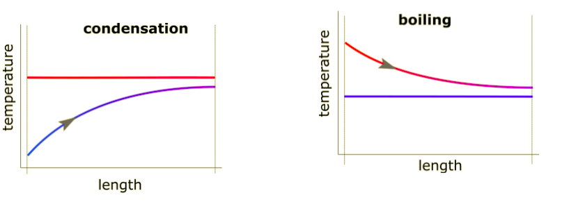 In some situations, phase change might be present on one side of the heat exchanger. For fluids, this could be boiling on the cold side or condensation on the hot side. In these cases, the temperature profiles would look like this:
