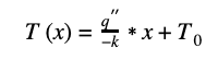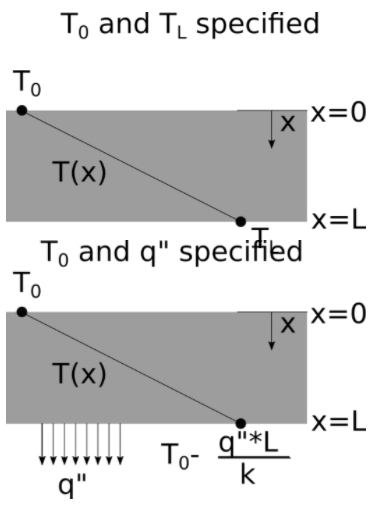 Now, let’s leave a constant temperature boundary condition at x=0: T(x=0)=T0, and apply a constant heat flux boundary condition at x=L: -k(dT/dx)|x=L = q’’ where it is assumed that the value of q’’ is specified. The thermal conductivity of the body is “k”. These boundary conditions result in the temperature distribution: