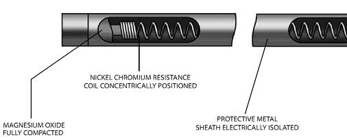 Los calentadores marinos de brida consisten en múltiples tubos metálicos doblados, también conocidos como elementos calefactores, soldados en una brida de acero. (Nota: solo un tubo está conectado a la brida en la ilustración de la figura 1). Cada elemento calefactor contiene un cable de resistencia de níquel-cromo rodeado de óxido de magnesio y un recubrimiento metálico en la superficie para su protección (figura 2). El cable de resistencia en espiral genera el calor por medio de una fuente eléctrica y el calor se distribuye uniformemente en todo el tanque. Un calentador marino de inmersión de brida está diseñado para ajustarse de forma compacta al contenedor de destino.