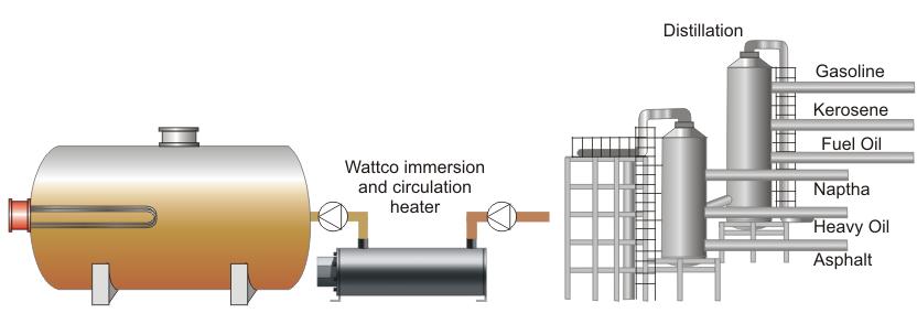 WATTCO™ desarrolla y fabrica una variedad de calentadores de aceite de circulación y de inmersión de grado profesional para la industria de refinación de petróleo (Vea la Imagen 1). Estos calentadores son un componente integrante del equipo de barrido con aceite que se utiliza para la limpieza de tuberías, las líneas de transporte y las mangueras de lubricación.