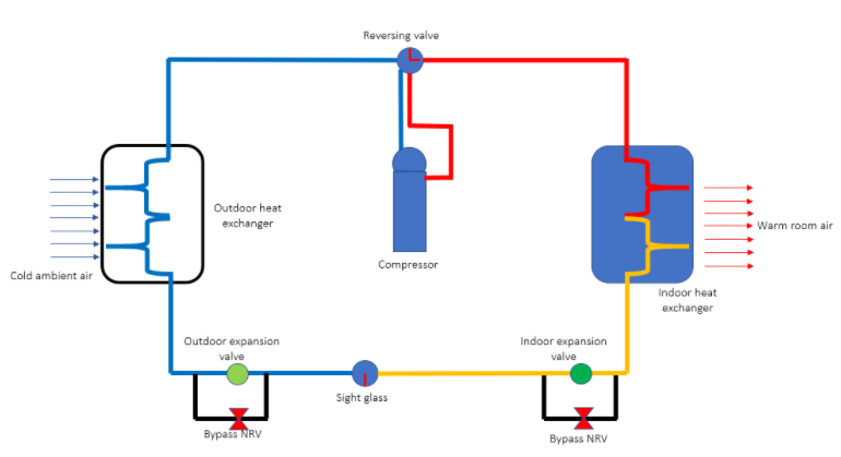 La plupart des pompes à chaleur peuvent offrir des options de refroidissement et de chauffage des locaux grâce à la vanne d’inversion. En mode chauffage, le réfrigérant est comprimé dans le compresseur et sort sous forme de vapeur surchauffée à haute pression et haute température dans la vanne d’inversion. Les vannes d’inversion (puisqu’elles fonctionnent maintenant en mode chauffage) dirigeront le réfrigérant vers l’échangeur de chaleur de l’unité intérieure. Le courant d’air forcé passe par l’échangeur de chaleur intérieur, ce qui permet d’évacuer une partie de la chaleur dans l’espace que vous souhaitez chauffer.